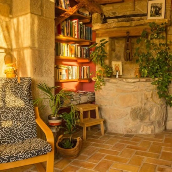 Por la escalera se accede a la planta superior donde están las habitaciones, la sala de lectura, el rincón infantil, la bóveda: un espacio para desconectar que "dicen" se respira tranquilidad, la piscina,...